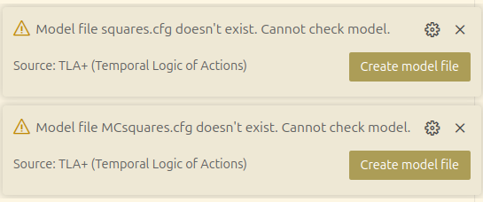 We now have a simple specification. In order to check it using TLC, we need to create a model file first. As an experiment, try running TLA+: Check model. It should fail because of the missing model file, and show two notification boxes that allow you to create a model file from a template: Create a new file "squares.cfg" in the same directory (either manually or by using the Create .cfg button), and use the following configuration: